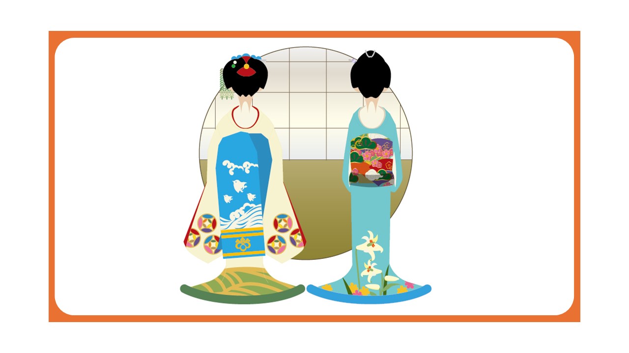 舞妓會穿著顏色鮮豔的振袖,藝妓的和服顏色偏向黑或藍等暗色系,散發出沉穩高雅的氛圍。此外,舞妓綁的腰帶為長達5~6公尺的「垂帶(だらりの 帯 )」,藝妓則會將腰帶綁成「 太鼓結 」。
