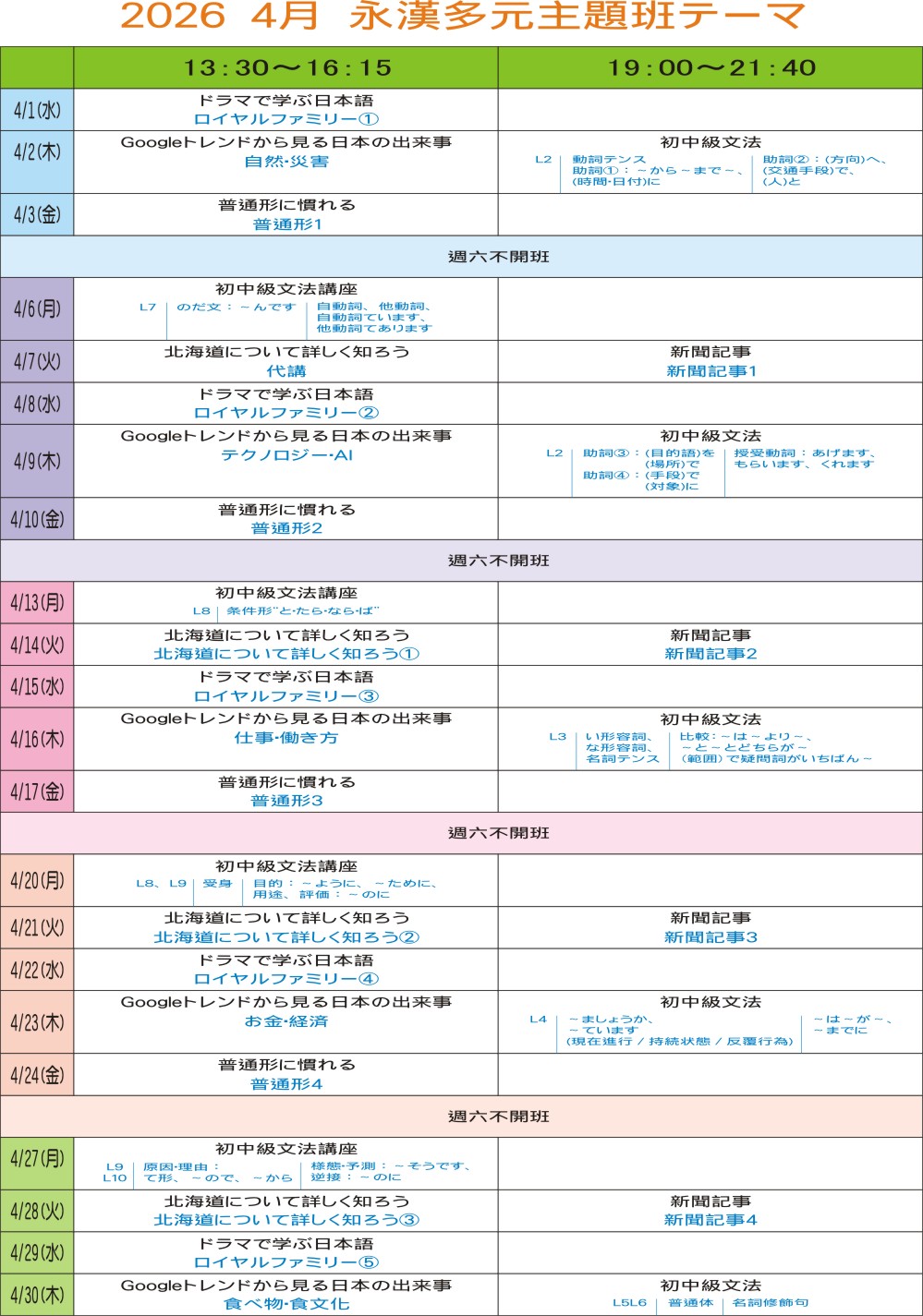 | 木曜 | 高級:Google トレンドから見る日本の出来事(小川一馬老師) | 初中級:初中級文法(王韋蘋老師) |