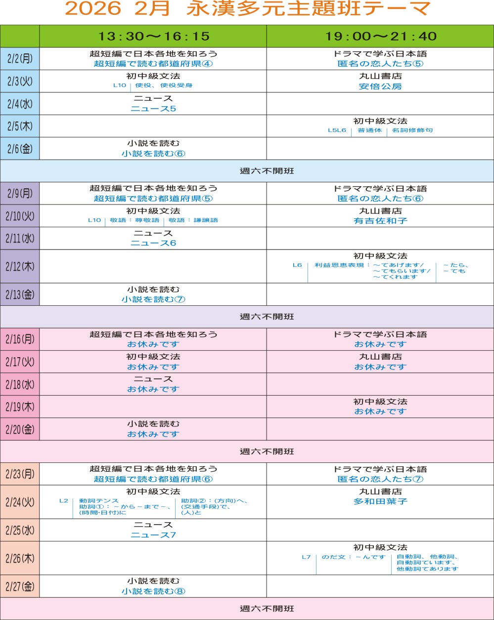 火曜 初中級:初中級文法(王筱芳) 高級:丸山書店(丸山未津希)